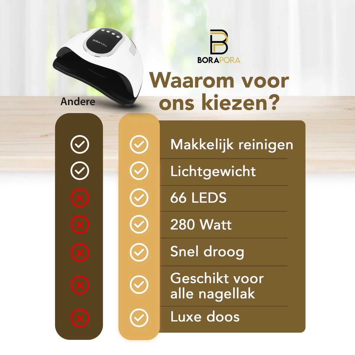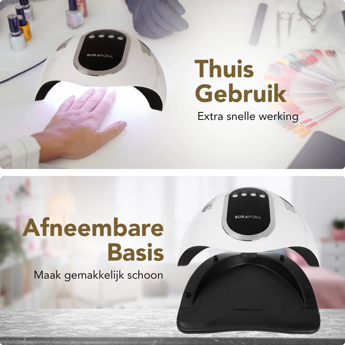 Met de Professionele Nageldroger van BoraPora kunt u eenvoudig, snel en zeer efficiënt uw nagels laten drogen. U behaalt een professioneel resultaat zoals u in de salon zou verwachten, maar dan thuis! Ook geschikt voor professioneel gebruik dus! Dit is mogelijk dankzij de 66 LEDS van de 280 Watt UV LED lamp. Ook is de opening zowel geschikt voor uw hele hand (inclusief duim) als uw voet!
