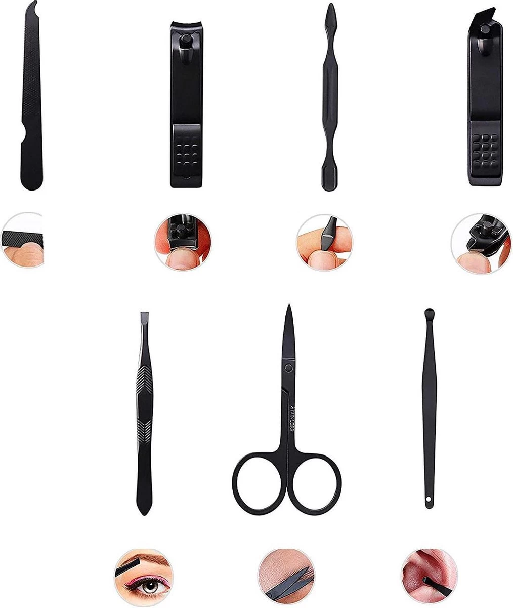 - Handverzorging (normale nagelknipper, schuine nagelknipper, nagelschaar, nagelvijl); voetverzorging (normale nagelknipper, schuine nagelknipper, nagelschaar, nagelvijl); gezichtsverzorging (wenkbrauwpincet, oorreiniger)