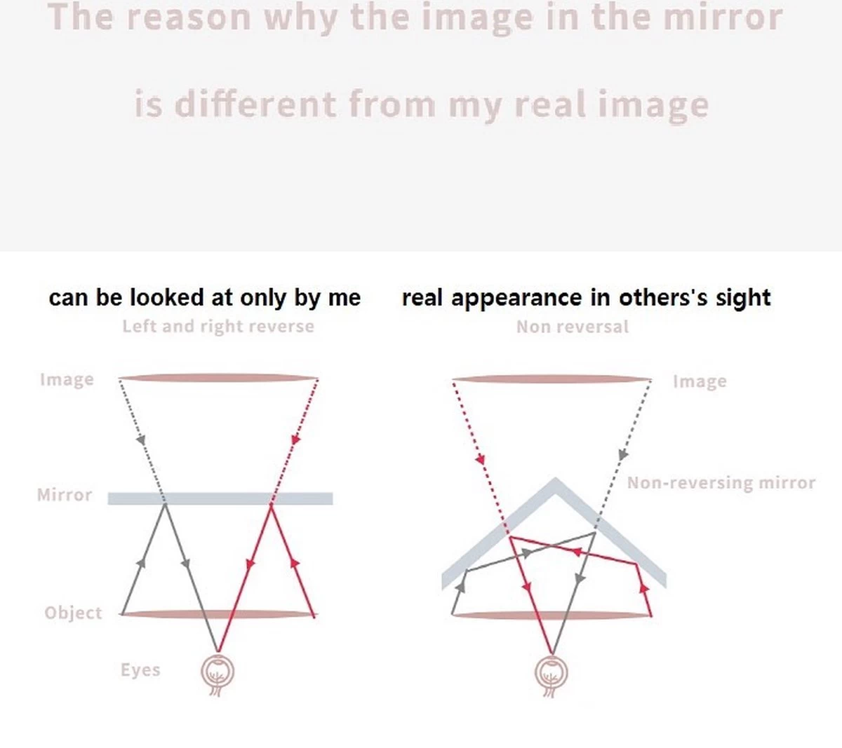 De niet-omkeerbare spiegel lost dit probleem op en stelt je in staat je uiterlijk te verbeteren en versieren vanuit het perspectief van anderen. Het kan worden gebruikt om de gezichtsasymmetrie te verbeteren door middel van gezichtsyoga, het controleren van het uiterlijk voordat je naar buiten gaat en het corrigeren van make-up.