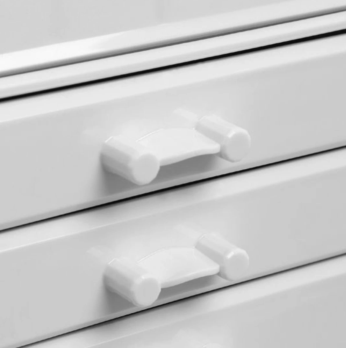 Praktisch en chique design – in melkwit, fijn bewerkt en de handgrepen zijn in de vorm van een pruimenbloesem; de vakken op de 1. niveaus zijn in verschillende hoogtes en groottes, zodat de spullen altijd stabiel opgeborgen kunnen worden.