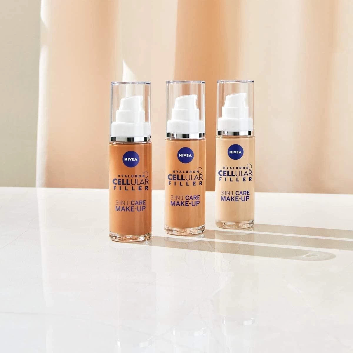 De Nivea Hyaluron Cellular Filler 3-in-1 verzorgingsmake-up combineert 3 huidverfraaiende functies in slechts één flesje. 1. De teint wordt geperfectioneerd door hoogwaardige kleurpigmenten, die zacht met de huidtint versmelten, zo worden oneffenheden en roodheid verborgen. 2. Tegelijkertijd wordt de huid door de niet-vettige formule met 12 uur lang vocht voorzien. 3. Bovendien vermindert de met hyaluronzuur verrijkte foundation van de make-up fijne lijntjes en rimpels zichtbaar – voor een gezond uitziende en stralende huid dag na dag.