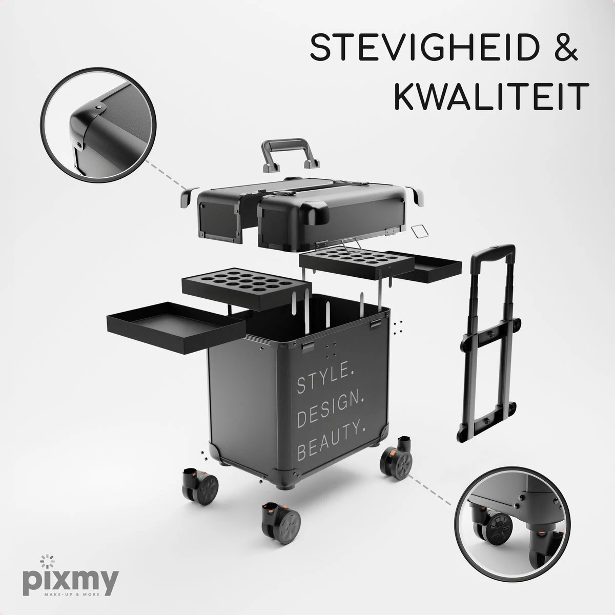 Ben jij een make-up artist, kapper, nagelstyliste of pedicure, en ben je klaar met het onhandig gesjouw van uw inventaris tijdens het reizen naar klanten? Stop dan met zoeken: de PIXMY® Make Up koffer is de perfecte oplossing voor jou! De koffer is uitgerust met 5 opberg compartimenten, waaronder 2 make-up trays waar je gemakkelijk al je nagellak flesjes of andere cosmetica in kunt uitstallen. Daarnaast breid je eenvoudig en snel je capaciteit uit door de meegeleverde reis cosmetica tas te koppelen aan je koffer. Zo blijf jij flexibel, en kun je toch nog wat extra’s meenemen wanneer het nodig is.