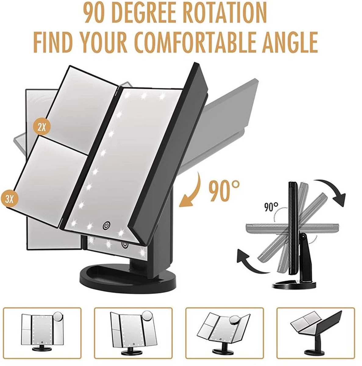 De spiegel heeft ook twee zijspiegels die kunnen worden ingeklapt, evenals één kleine ronde spiegel met 10x vergroting en zuignappen. De ene kant van de twee spiegels heeft een vergroting van 2x en 3x. Aan de onderkant van de spiegel bevindt zich een handig bakje waar u uw make-up in kunt doen.