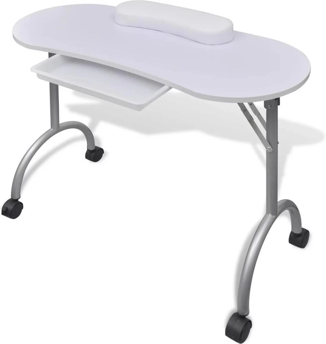 De vier vergrendelbare wieltjes zorgen ervoor dat de tafel eenvoudig kan worden verplaatst. Onze manicuretafel gaat lang mee door de stevige stalen poten. Hij kan in een handomdraai worden ingeklapt om plaats te besparen.